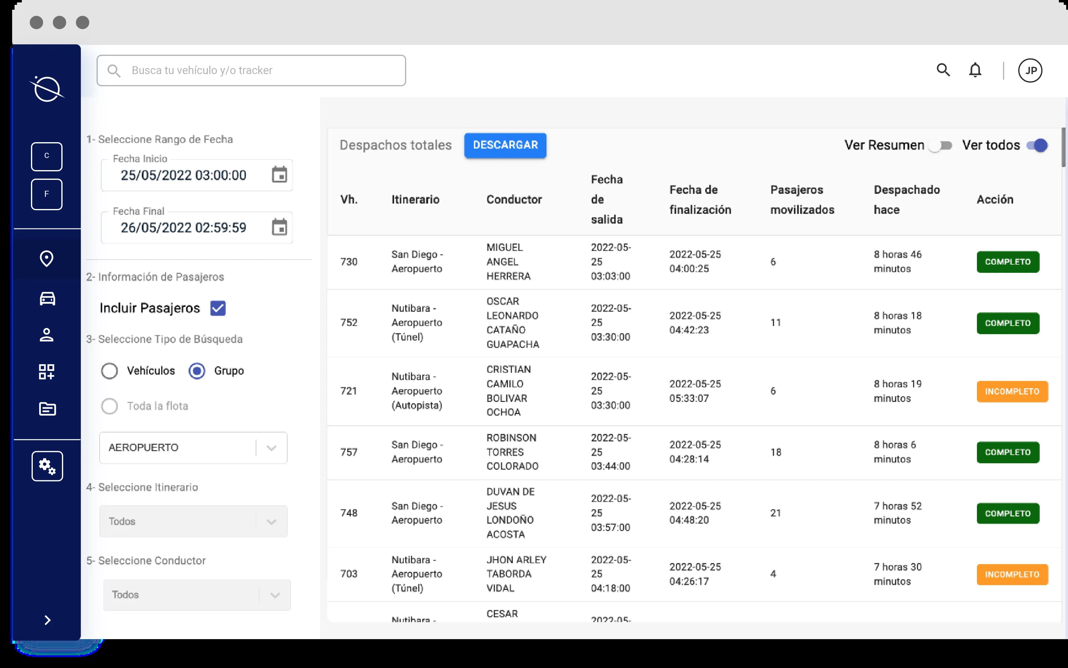 Para cada periodo de tiempo y rango de fechas por viaje realizado, puedes visualizar: - Estado de finalización del viaje. - Total de pasajeros movilizados. - Tiempo total de viaje. - Cancelar cualquier viaje activo.